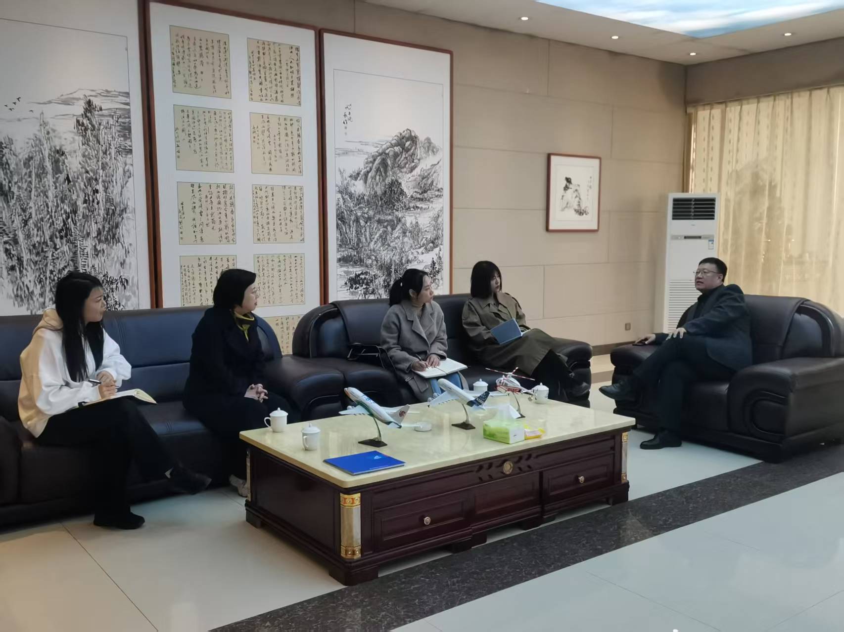 調(diào)研組一行首先參觀了企業(yè)的飛機展廳,邱志剛董事長詳細介紹了公司發(fā)展歷程、技術(shù)研發(fā)及產(chǎn)品布局。在隨后召開的座談會上,雙方共同觀看了神鷹航空集團宣傳片,深入了解企業(yè)在無人機研發(fā)、通航制造等領(lǐng)域的創(chuàng)新成果。